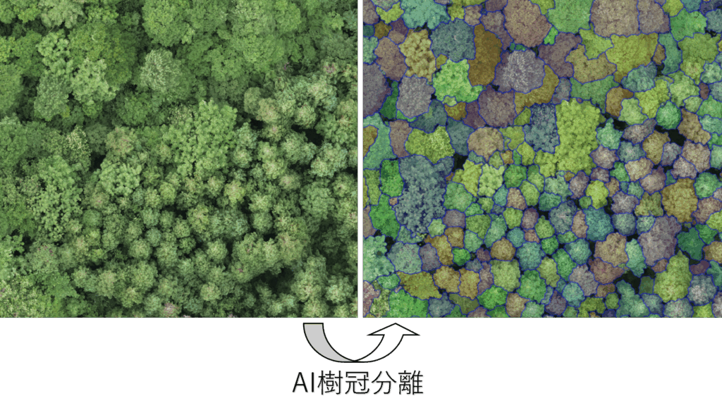今回、DeepForest社では、AI(ディープラーニング)を活用し、多様な教師データを学習させることで、広葉樹林の樹冠分離を自動で行う機能の開発に成功しました。