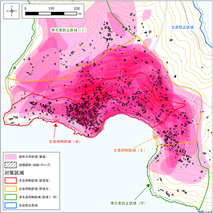 ▲枯損・ギャップ区域と累積営巣区域重ね合わせ